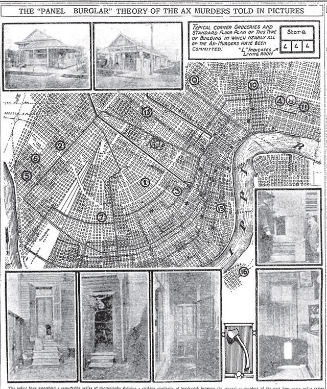 The Axeman of New Orleans was a serial killer who terrorized the city of New Orleans and the surrounding area from May 1918 to October 1919, killing at least six people and injuring many others. The killer gained entry into homes by chiseling out door panels and attacked victims — often Italian-American grocers — with their own axes or straight razors. The Axeman sent a letter to local newspapers threatening to kill again but promising to spare any house where a jazz band was playing. The murders stopped abruptly in 1919 after a suspected victim's husband was himself found dead in New Orleans, but the Axeman was never identified.